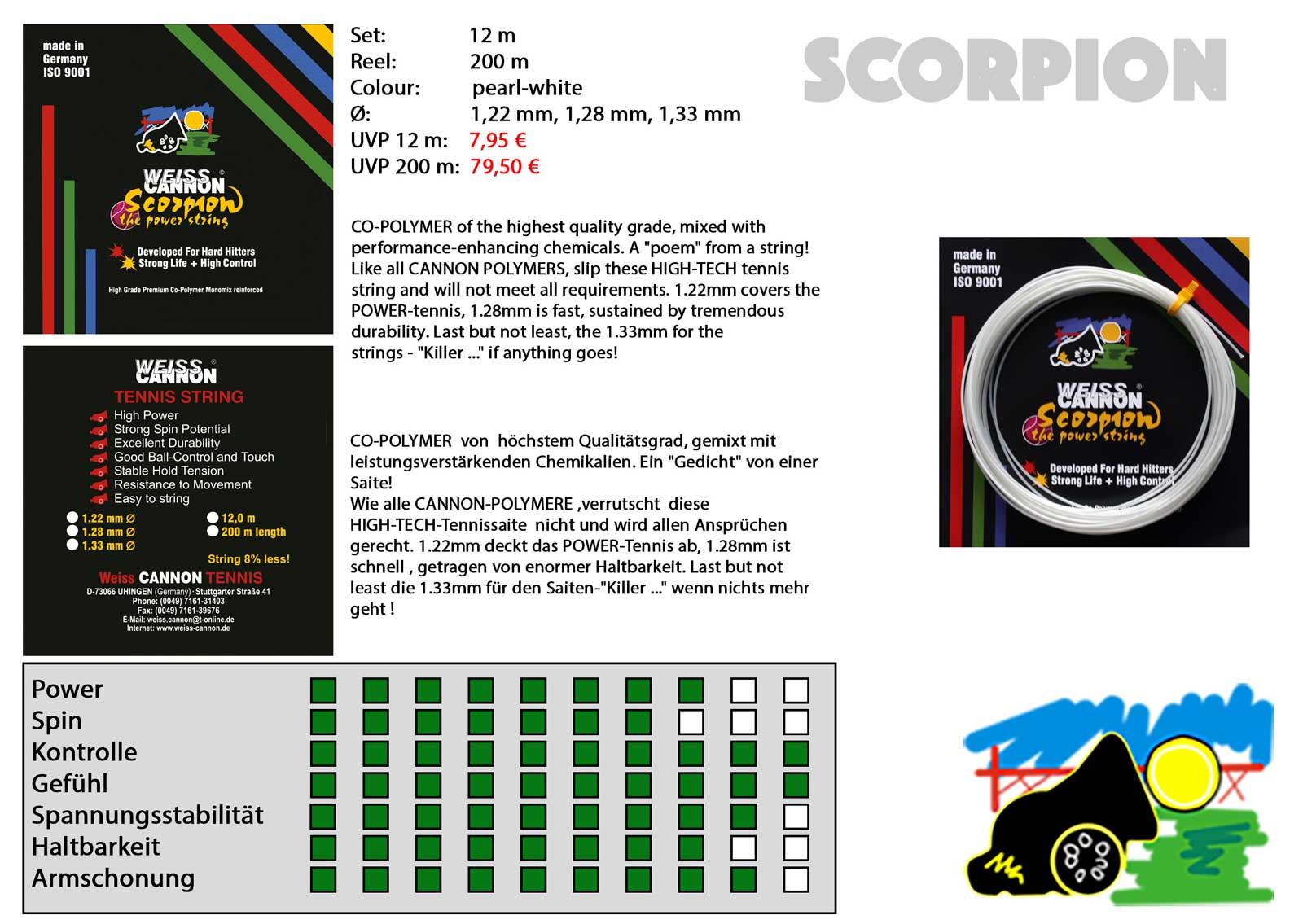 V kolikor iščete dobre igralne lastnosti, kontrolo in nekaj dodatne moči je struna Weiss Cannon Scorpion prava izbira za vas. Ponuja solidne igralne lastnosti in presenetljivo moč, kontrolo, udobje, obstojnost, spin potencial in se ne premika. Za to je še posebej primerna za tako imenovane „heavy hitters-e”. Primerna je tako za samostojno uporabo, odlično pa se izkaže tudi v vseh hibridnih kombinacijah.