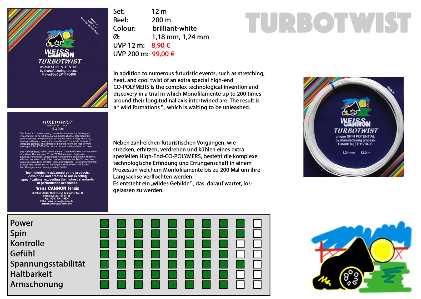 Ta unikatna struna Weiss Cannon Turbotwist je izdelana iz visoko elastičnih polimerskih vlaken, ki so do 200 krat zasukana preko vzdolžne osi. Struna nudi neverjeten spin potencial in velikansko moč. Posebni unikatni kemični proces jo naredi še boljšo, hitrejšo in bolj živahno. Kot takšna je primerna za vse tipe igralcev, seveda pa bodo nad njo še najbolj navdušeni topspin igralci.