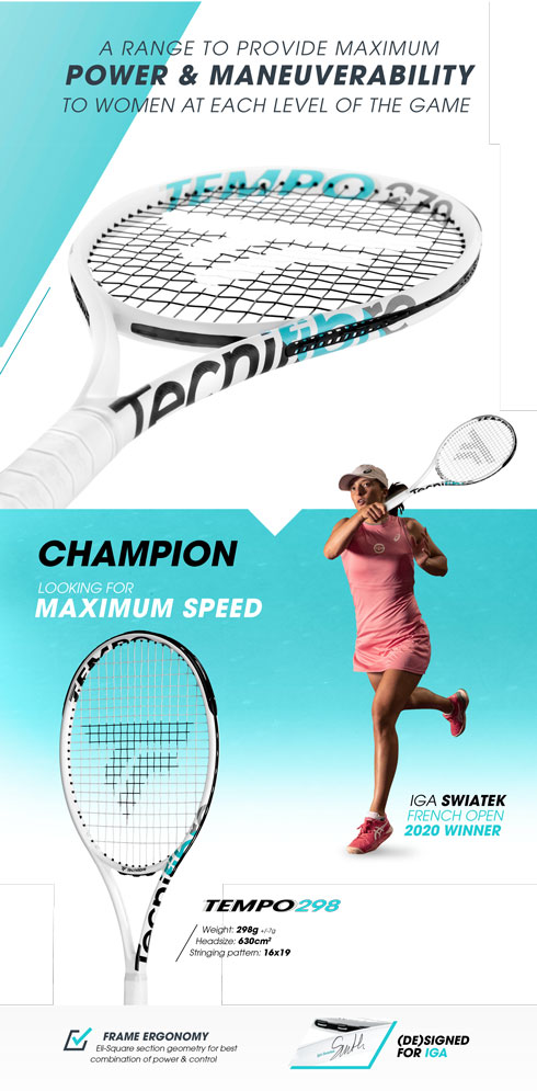 Tecnifibre že več let skrbi, da izdeluje opremo, ki je namenjena dekletom. Namreč tako kot imamo v smučariji ženske "dile" in pri golfu opremo prilagojeno za ženske, je enaka zgodba tudi pri teniških loparjih. V tem letu je tako na trg prišla nova kolekcija loparjev Tecnifibre Tempo. Na touru z njim igra trenutno najboljša teniška igralka na svetu Iga Swiatek, ena najboljših igralk med dvojicami Elise Mertens in zelo perspektivna mlada igralka Elsa Jacquemot.