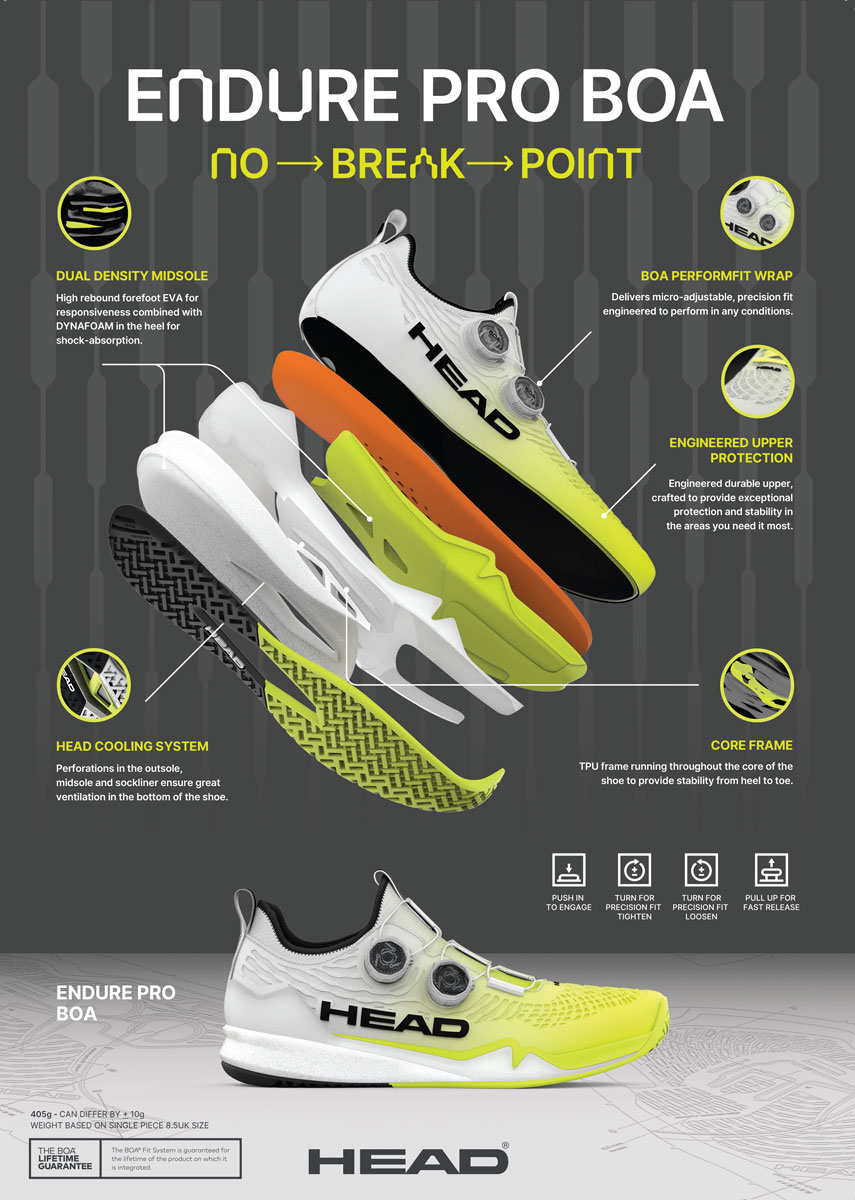 so del nove serije ENDURE, ki združuje najboljše iz modelov REVOLT in SPRINT, copati HEAD ENDURE PRO BOA CLAY MEN predstavljajo vrhunec inovacij in zmogljivosti za peščene podlage. Z dvema Li2 BOA® koleščkoma in tehnologijo PerformFit™ Wrap omogočajo natančno, mikro-nastavljivo prileganje in izjemno stabilnost pri stranskem gibanju.