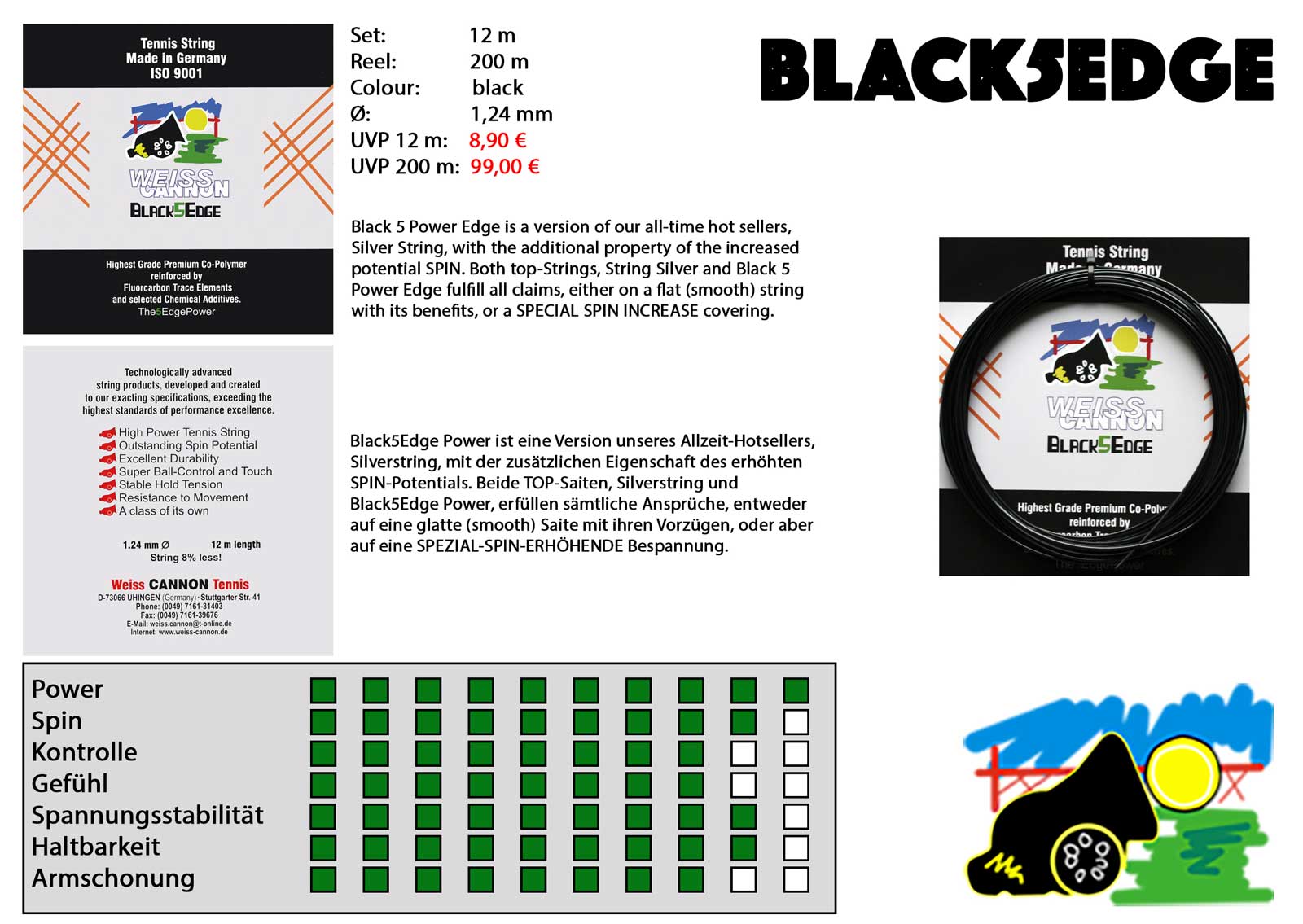Povsem nova struna Weiss Cannon Black5Edge Power je nastala na podlagi njihove najbolje prodajane strune Silverstring. Po številnih testiranjih ki so jih opravili, so ugotovili, da daje 5 kotna oblika najbolj optimalen spin v kolikor je uporabljena POLYAMID-na struna, hkrati pa nudi dodatno moč. Namenjena je vsem bolj izkušenim igralcem, ki si želijo odličen spin potencial, dodatno moč in ne pretrdo struno, ki odlično drži napetost napenjanja.
