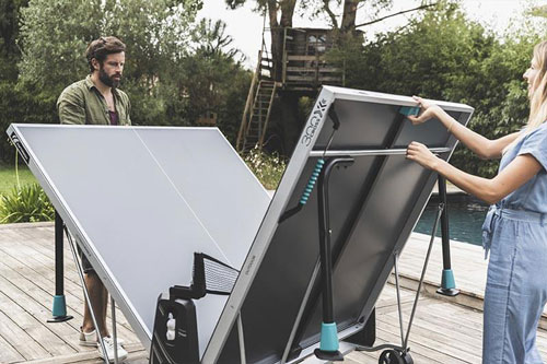 Miza vključuje tudi nastavljivo mrežo po napetosti, ki se namesti ob straneh in je ni potrebno odstraniti, ko mizo zložimo. Zložena miza porabi malo prostora, za prestavljanje ima kolese pri čemer sta 2 opremjena z zavorami, da je miza čimbolj stabilna in varna.